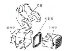 高壓連接器結(jié)構(gòu)更加精密復(fù)雜,與低壓連接器相比,主要增加了內(nèi)外屏蔽環(huán)及高壓互鎖。低壓連接器結(jié)構(gòu)組成如下圖所示,一般由拉桿、密封圈、殼體、TPA等結(jié)構(gòu)組成。